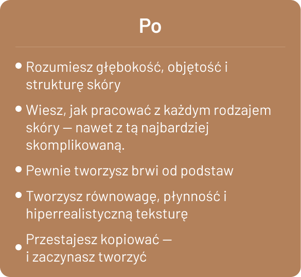 Pokazuje, jak patrzeć oczami artysty i tworzyć brwi, które wyglądają jak żywe.