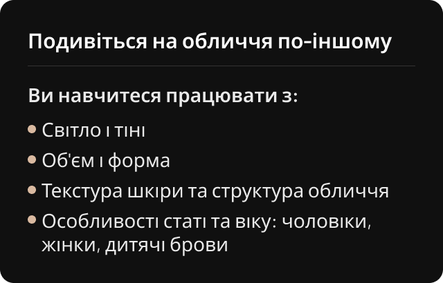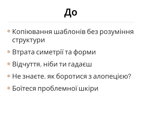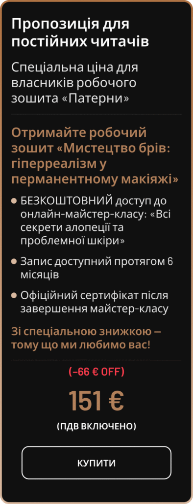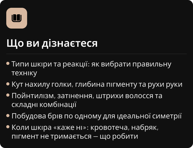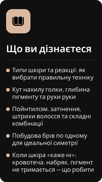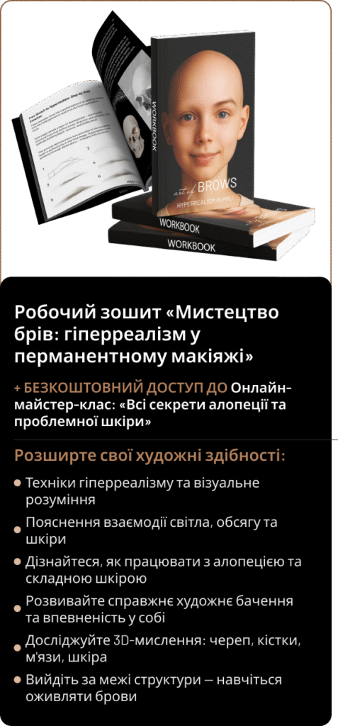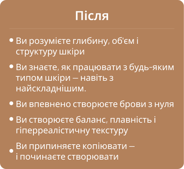Моя мета – допомогти вам перестати гадати. Надати вам інструменти по-справжньому бачити форму — структура кісток, об’єм, ритм — і створюйте брови як майстер. Особливо, коли шкіра стає проблемною.